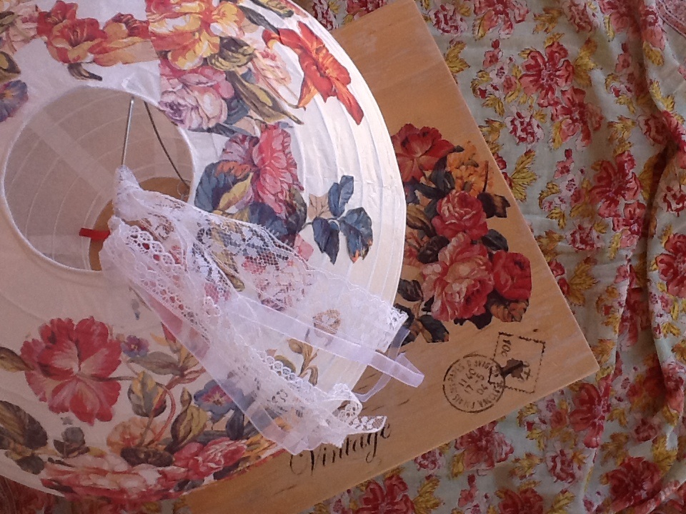 La lámpara era un trabajo que me hacía especial ilusión ya que era un reto hacer decoupage sobre papel.En lugar de poner la cola sobre el papel decidí ponerla sobre la servilleta ya recortada,para no empapar la lámpara. Al final en forma de colgante puse unas puntillas y cintas para darle un efecto shabby.